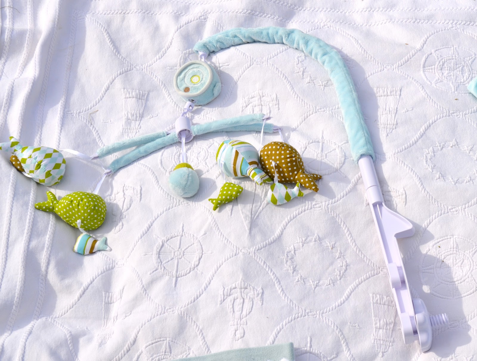 There's a quilt, a knitted blanket, a bed skirt, a bumper, a diaper stacker, 2 fitted sheets, a changing table cover, and a mobile that winds up, spins and plays music!